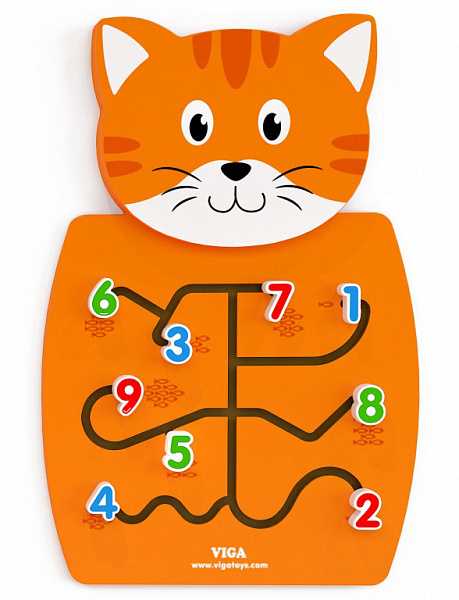 Панель «Кот-цифры» - настенная игра на сопоставление цифр с картинками, предназначена для изучения цифр, счета, цвета, развития логического мышления и мелкой моторики. Предназначена для групповых и индивидуальных занятий. Панель выполнена в виде кота и представляет собой линейный цифровой лабиринт с подвижными элементами в виде цифр от 1 до 9. В прорези панели закреплены цифры от 1 до 9 (предусмотрена возможность их снятия с панели). В конце каждой дорожки нарисованы рыбки: от 1 до 9. По углам панели размещены отверстия для крепления панели к стене, к пособию прилагаются комплектующие для монтажа на стену и инструкция по монтажу.